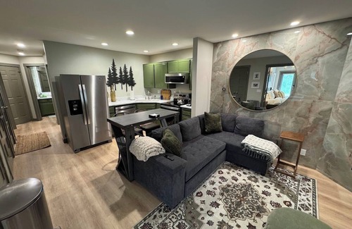 After a day of exploring Schweitzer Mountain or nearby trails, the inviting open-concept living space offers the perfect place to relax and recharge. Gather around the custom stone fireplace surrounded by rich wood accents and plush seating that invites you to kick back and savor the moment. Whether you prefer streaming your favorite shows on the 50” Smart TV or simply soaking in the mountain ambiance with a glass of wine, this living room is designed for comfort and enjoyment.