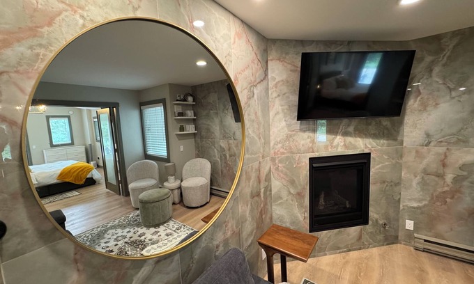 Despite its compact size, the bathroom packs a luxurious punch. It boasts a custom soaking tub perfect for relaxing after an active day outdoors. The heated anti-fog mirror offers convenience during your morning routine, and the state-of-the-art smart toilet features a heated seat, bidet functions, air filtration system, and remote control—offering an experience you’ll appreciate throughout your stay.