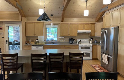 The heart of the Lodge is the great room, which features a modern kitchen that can handle a crowd with ease, a large island with 6 bar chairs, a 12-person dining table, a round table for games and puzzles that seats 6, plenty of comfy furniture for lounging, and big windows for light, views, and breezes. There is no air conditioning, but there are multiple ceiling fans and at least one portable or window fan for each bedroom and the great room. There are beautiful wood floors and finishes throughout.
