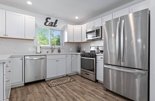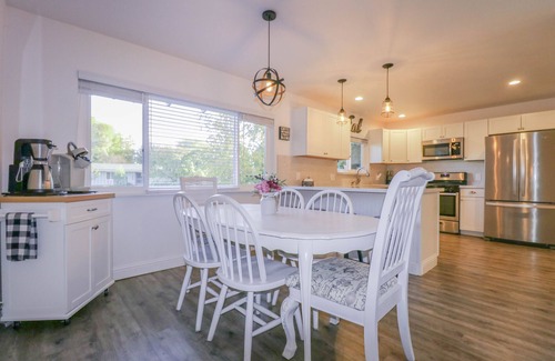 This thoughtfully designed accommodation comes equipped with all the amenities you need for a seamless stay. The home features an open kitchen, fully stocked with cooking essentials, alongside a cozy living room complete with a large-screen smart TV. Enjoy fun evenings by the outdoor fire pit or take in the soothing sounds of the creek while relaxing in the seasonal flower and vegetable gardens. Each of the four beautifully decorated bedrooms provides ample space for guests to unwind, ensuring everyone feels right at home during your wedding festivities.