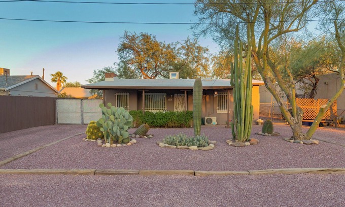 Located in Central Tucson, this pleasant house offers 2 bedrooms - one with a queen bed and the other with a cozy sofa bed and a full in-house office with a standing desk, monitor, a camera, and keyboard. The bathroom features a relaxing bathtub for guests to unwind after a day of exploring. With amenities like AC & heating, high-speed WiFi, hot tub, and an in-home designated office, our welcoming property is perfect for both long and short stays to make your visit one to remember.