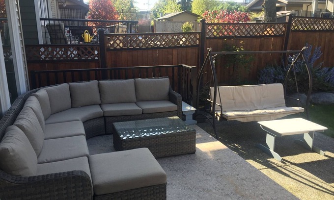 Our home is on a quiet family oriented street with a small kids park 5 doors down. Located in White Rock, 1 block south of the Peace Arch Hospital near the Semiahmoo mall, public transit and only 1km to the beach, golf courses, large parks and trails. Our home has a great combination of indoor and outdoor living spaces. A large patio off of the master bedroom to enjoy the morning sun and a back patio to enjoy a very comfortable evening barbecue. With a wide open front and back great room you can also enjoy a break for the sun on hot days with air conditioning and music from our in-home sound system circulating throughout.
