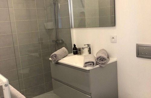 The fully equipped kitchen includes everything you need to prepare your meals (fridge, hob, microwave, Nespresso coffee machine, filter coffee machine, kettle, and toaster). The private bathroom is equipped with a shower, sink, and towel dryer to freshen up after a day at the beach.