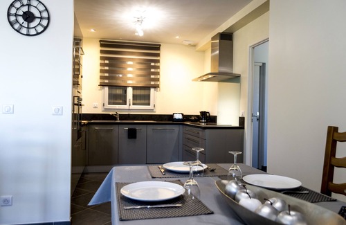 - the open kitchen offers new and high-quality equipment: oven, built-in microwave, induction hob, Nespresso coffee machine, kettle, toaster, crockery and plenty of cooking utensils…