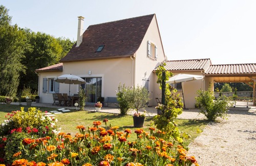 Pretty new villa ideally located in the heart of the Périgord Noir, close to the Dordogne river. The house offers a very beautiful living space, very bright with a large opening onto the garden.