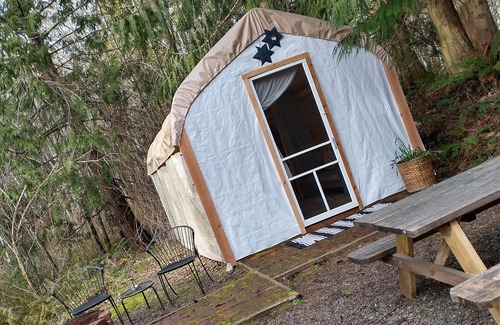 9Mile Adventures presents this dreamy take on OFF GRID, low footprint camping. Located on Marrowstone Island make it base camp for exploring Port Townsend, the Olympic peninsula & Coast. Many island beaches and parks to enjoy under sunnier skies thanks to the infamous "banana belt". Unplug in the truest sense of the word no electricity or running water. Tent is set up for two. Self operated woodfired soaking+ cold plunge tubs open 24hrs.