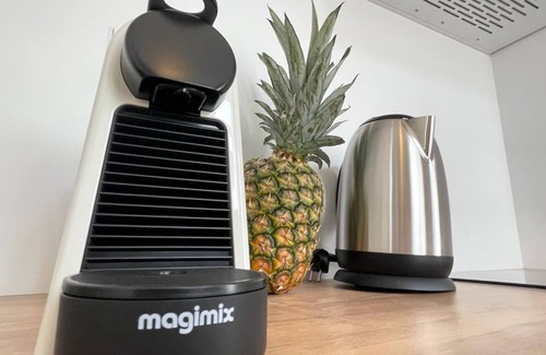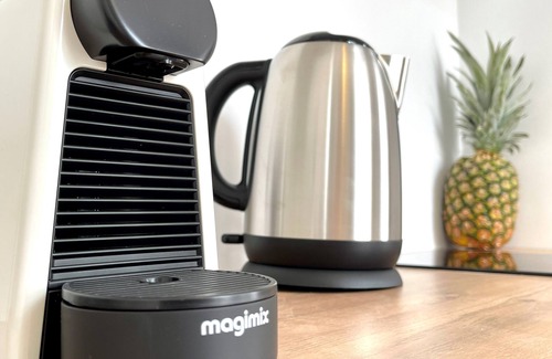 - a kitchen and dining area (fridge, induction hob, microwave, pod coffee maker, kettle, pots, dishes, etc.),