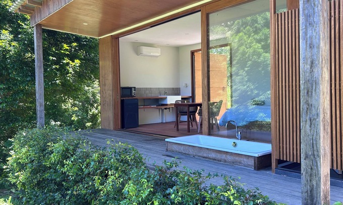 There is a bbq, open shower & outdoor bath on a deck overlooking a paddock which reaches down to the river rainforest.