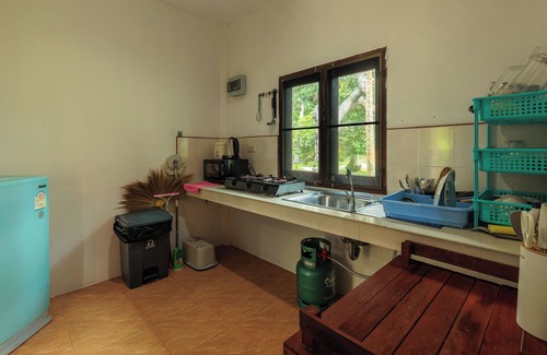 The kitchen is fully equipped for easy cooking. You'll find everything you need, including a blender, microwave, ricecooker, and all the equipment to prepare your meals effortlessly.