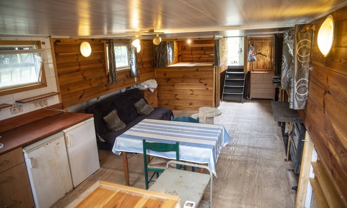 Layout: Boat: (Kitchenette(hob(4 ring stoves, gas), electric kettle, hood, coffee machine, fridge, freezer), Living/bed room(double sofa bed, double loft bed(twin duvet, twin fitted sheet, 140 x 200 cm), TV(flatscreen, satellite, digital), dining table(4 persons), stove(wood)), terrace, roof terrace) Log cabin: (bathroom(shower, washbasin, heating(electric)), sanitary facility(toilet)) jetty, patio, terrace(private), garden, garden furniture, pond, Sunscreen, Garden shed