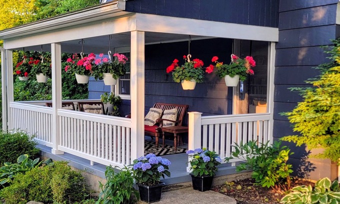 Step into your private outdoor oasis! Enjoy morning coffee on the side porch or sip a cocktail on the sunset porch. Our spacious deck, complete with cushioned seating, a table, and an umbrella, is perfect for alfresco dining. Head to the lower cobblestone patio to fire up the grill or relax on the hammock or benches by the fire pit. Our lush organic garden offers fresh cucumbers, tomatoes, onions, peppers, and chives for you to pick and enjoy.