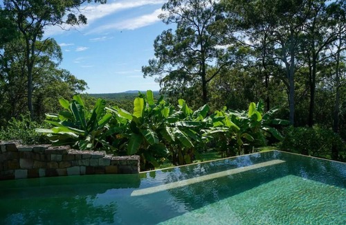 Recharge in luxury at this unique and tranquil retreat. Set on 18 acres in the Noosa Hinterland and offering complete privacy, with views from the infinity pool across permaculture gardens and district bushlands to Noosa Heads and Peregian beach. Peregian beach and Eumundi markets are just 10 minutes away and 20 minutes or so to Noosa.