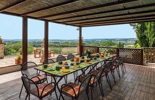 The whole property of about 2 hectares is covered mainly by olive trees. The garden is about 4000 square metres and consists of a lawn, cypress trees and lavender and rosemary bushes. Between the house and the pool is a large gazebo with tables and chairs, the ideal spot for dining outdoors whilst admiring the panorama at sunset.Please notice that photos are taken in spring, therefore flower blossoming, and the colours of the gardens' grass could be different at the moment of your arrival at the villa.