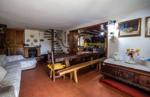 9-room house 328 m2 on 3 levels. Antique and stylish furnishings: open large living/dining room with open-hearth fireplace and TV (flat screen). 1 room with 1 bed. Walk-through room with 1 double bed, shower/bidet/WC and TV (flat screen), air conditioning. Exit to the garden. 1 double bedroom with shower/bidet/WC and TV (flat screen), air conditioning. Exit to the garden. 1 double bedroom with shower/bidet/WC and air conditioning. Large kitchenette (oven, dishwasher, toaster, microwave). Shower/bidet/WC. Upper floor: (spiral staircase), 1 double bedroom with shower/bidet/WC. (exterior staircase) living room with TV (flat screen). 1 double bedroom with TV (flat screen), air conditioning. 1 double bedroom with shower/bidet/WC and TV (flat screen), air conditioning. Kitchen (4 hot plates, mini-oven, oven) with dining table. Bath/bidet/WC. 2nd upper floor: (spiral staircase), 1 room with sloping ceilings with 2 beds and TV (flat screen), air conditioning. View of the countryside. Facilities: washing machine, hair dryer. Internet (WiFi). Maximum 1 pet/ dog allowed. IT051017C2N4ARYSWE