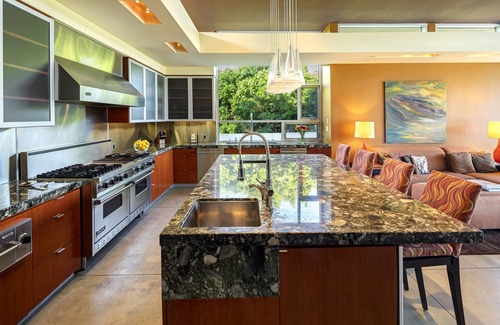 The separate casita features two more queen-size bedrooms, as well as a sitting room, kitchenette, and a pub-style dining table for 4.