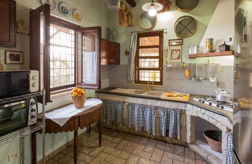 The house has just one floor. Entering, you are immediately greeted by the living area which includes the dining table and the sitting area with sofa in front of the working fireplace. The adjoining kitchen is in typical Sicilian brickwork with, to the side, a pantry with the dishwasher. The sleeping area, separated from the living room by a large stone arch and a corridor reached up two steps, consists of two double bedrooms, one of which with ensuite bathroom with shower, a twin bedroom with two beds and a further bathroom with shower. The annex, with access from the outside, is composed of a double bedroom and a bathroom with shower in which the washing machine is also located. The spa, with separate entrance, consists of a heated 4-seater whirlpool tub, a 2-seater Finnish sauna, an emotional shower and a relaxation area with chaise longues. Air conditioning only in the bedrooms.