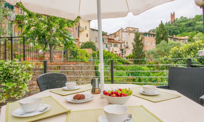 Modern, beautiful terraced house "Il Giardino di Lucia", 140 m a.s.l detached, built in 1290, renovated in 2020. In the centre of San Miniato Alto, excellent location: right in the centre but still quiet. Private: terraced garden, 150 m2 (fenced) with flowers. In the house: fitness room. Public parking 200 m on the road. Grocery, supermarket, restaurant, bus stop 100 m, railway station 800 m. Nearby attractions: Marina di Pisa 50 km, Firenze 45 km, Pisa 45 km, Lucca 45 km.
