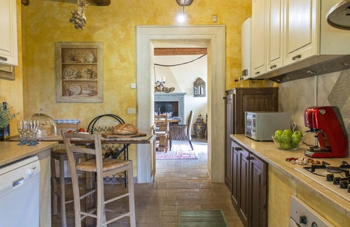 Il Noceto has two floors. The main entrance, adorned by a wreath of climbing jasmine, leads directly into a large space composed of the living room with satellite TV, connected by a large arch to the dining room with fireplace. From here you go on to the kitchen and to a small hallway that leads to a bathroom with shower and a twin bedroom (with joinable beds). The French windows in every room on this floor provide direct access to the large portico set up as a dining and seating area, overlooking the pool. An internal staircase near the entrance leads up to the first floor, consisting of a hallway around which are situated three bedrooms, a bathroom with shower and one with tub (with laundry area) and, finally, a terrace. (Please note that the fireplaces in the bedrooms are ornamental).