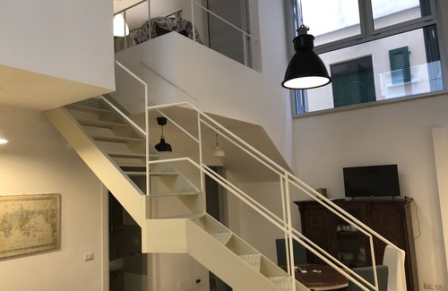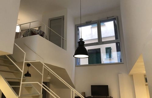 An apartment on two levels with a large double-height interior space. It is located on the mezzanine floor of a new elegant building located on the Scilla waterfront a few steps from the beach (less than 10 meters) and from the ancient church of the Spirito Santo (A. D. 1750 circa).