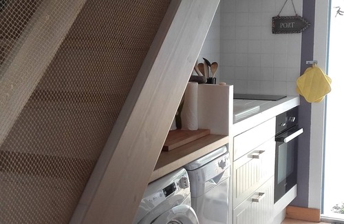 The ground floor includes: a fitted and equipped kitchen (dishwasher, oven ...), a south facing living room with a convertible sofa, a bathroom with walk-in shower.