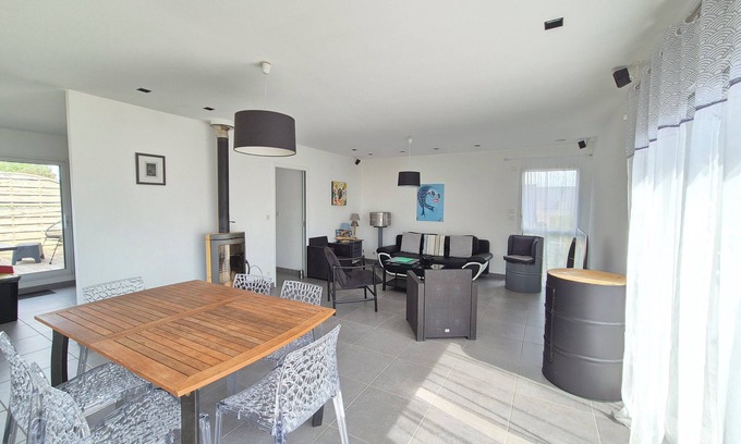 Atypical new house and equipped with 95 m2, 150 m from a beautiful white sand beach, and 1km walk from bars and restaurants. Bread and grocery store a minute walk away.