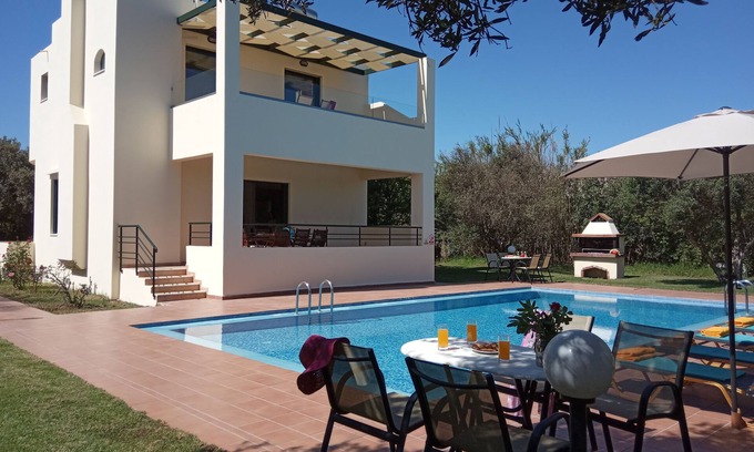 Villa Ilos is a beach-lovers delight, with Gerani Beach only a few minutes' walk away, along with a small selection of shops and restaurants. This 4 bedroom villa,with 3 bathrooms (3 bedrooms,one large bed and two single beds each are on the floor with 2 bathrooms and one large bedroom is on the ground floor with one shared bathroom), has a large private pool (5mx10m) for lazy days.Platanias resort area is just a short drive away. On top of this the resort centre of Chania and its quaint old town and harbour is 15 minutes' drive away. WiFi and air conditioning/heating in all bedrooms are included.