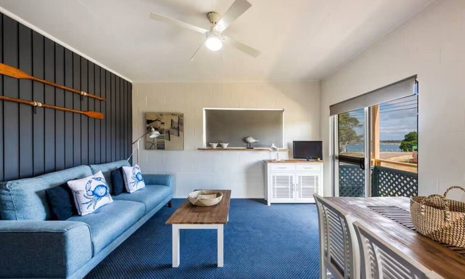 Ideally located this first floor unit has wonderful views of the river. Cross the road to enjoy a swim in the bay or a drink at Sedgers Reef Hotel. A short walk will have you enjoying fresh seafood at the Fisherman’s Co-Op, Moriarty’s Beach or the renowned Iluka Rainforest Walk. The main street with local shops and eateries is an easy walk away. The boardwalk passes your front door and is perfect for your morning walks before enjoying a coffee on your private balcony. This first floor two-bedroom unit has wonderful views of the Clarence River from the balcony and loungeroom. The unit is stylishly decorated with an inviting beach theme, is air-conditioned and includes Wi-Fi. The unit features two bedrooms, one with a queen bed and the other with two singles. Linen and essentials are provided. It features a shower and toilet, a combined lounge/dining room, a fully equipped kitchen and a private balcony complete with BBQ. Please note that there are stairs to access this unit. Should you need anything to make your stay more comfortable, our contact details are listed in your information folder which we have provided for you in your unit.