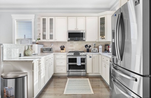 Fully Stocked Kitchen- Toaster, Knife set, Toaster oven, Keurig coffee maker, kitchen accessories, silverware, Nutribullet blender, T-fal pots and pans, glassware, and wine glasses.
