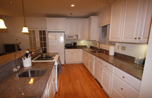 Modern Luxury: This custom cape was built in the fall of 2006. As you enter the large foyer, to the left through French doors is the kitchen, dining and living area that opens to the spacious 14' x 22' deck. Right of the foyer is a large laundry room, and then a self contained bedroom / bath suite. with a queen size bed. Upstairs is the master bedroom/bath suite with a queen size bed, a small bedroom with bunk beds and a third large bedroom/bath suite with a full size and a twin size beds. Floor plans available.
