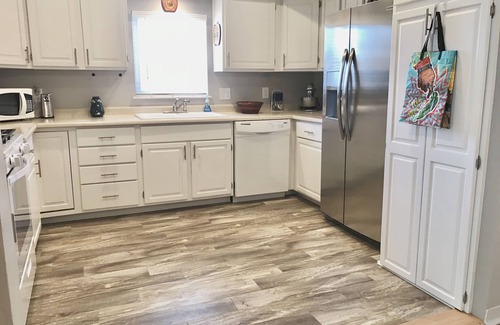This spacious four-bedroom home comfortably accommodates up to 10 guests, featuring two queen bedrooms, a delightful bunk room, and a twin room, along with a queen air mattress for extra flexibility. The property boasts two and a half bathrooms, ensuring convenience for all your guests. Enjoy a beautiful open floor plan that combines the kitchen, dining area, and living room, ideal for both lively celebrations and intimate moments. Step out onto the expansive covered patio to soak in breathtaking sunsets or unwind with a morning coffee amidst nature's beauty. With access to tree-lined walking paths and a nearby park, your outdoor wedding dreams can easily come to life.
