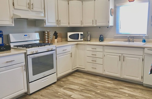 Modern Amenities: Enjoy modern comforts with two and a half bathrooms featuring luxurious touches, including a jacuzzi jetted garden tub, perfect for relaxing evenings post-wedding. The well-equipped kitchen caters to all cooking needs for your pre-event gatherings.