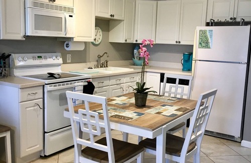 When you tire of eating out, enjoy cooking in your remodeled kitchen equipped with microwave, dishwasher, pots, Keurig, regular coffee maker, blender, dishes, drinking and wine glasses, and utensils. Kitchen has an open concept overlooking the living room and the TV. If dinner is a bust, head to the new restaurant right on premises or one of the many restaurants and/or tikis nearby and watch the boats passing through the channel at Jetty Park.