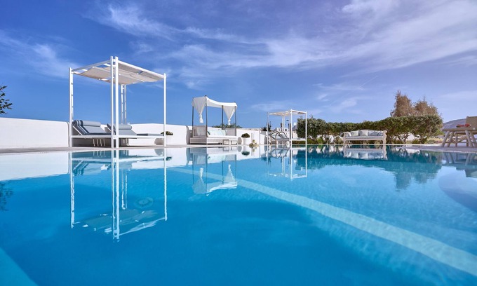 Maybe it’s the dreamy seaside setting, or perhaps it’s the cool exquisite interiors that exude a certain ethereal elegance and calm, that will make you wish your holiday could last forever and a day. Recline in the outdoor pool and watch the sky 'fall' as the clouds settle upon tranquil Santorini waters.