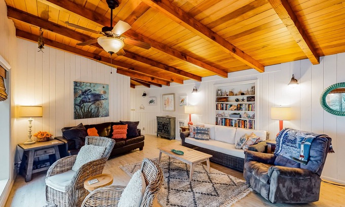 After dinner, you can explore the beach, play a family board game inside, or just find a quiet spot to curl up with a good book. When it's time to turn in, one bedroom has a queen-size bed, the living space has a single size sleeper, and the other bedroom has one queen making this house perfect for up to five guests.