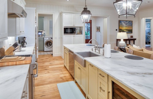 • Chef's kitchen with high-end appliances, oversized marble island (seats 5), and everything needed to entertain or cook in