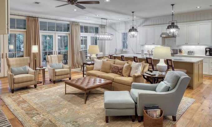 Tucked along a peaceful brick path in the heart of Palmetto Bluff, Sweetgrass Cottage is a beautifully curated 4-bedroom, 3.5-bathroom Southern retreat designed with families and groups in mind. Just steps from Wilson Lawn & Racquet Club, RT's Market, and the Montage Hotel, this inviting Lowcountry cottage features refined interiors, multiple gathering spaces, and a private backyard oasis with fire pit.