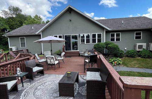 The house features spacious living areas indoors and outdoors, tastefully decorated bedrooms, 3 full bathrooms, and a fully equipped kitchen. An office is available for additional guests upon request, ensuring a safe and comfortable stay for families, couples, or groups of friends. There is plenty of room for entertainment within the open-concept home. Vaulted ceilings and large windows bring in sunshine and allow you to view the occasional passing deer. The walk-out basement offers a fantastic area for playing with family and friends, including a pool table, ping-pong, darts, video games, and a full gym. Step outside to enjoy the fresh air on our expansive patio, complete with outdoor seating, a flat-top grill, a lower-level fire pit, and a 6-person hot tub with breathtaking views of the surrounding landscape. You can relax and enjoy the sights and sounds of wildlife in the peaceful countryside.
