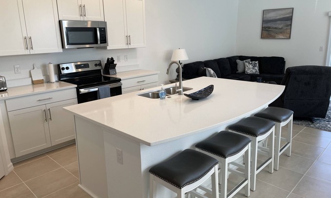 The kitchen boasts a beautiful quartz island with four barstools, stainless steel appliances and white cabinetry. The kitchen provides a stylish and functional space for enjoying a quick snack or preparing a culinary spread.