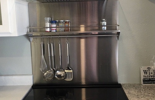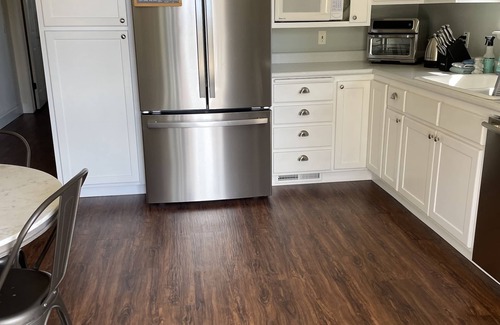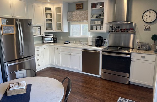 Inside you will fine a table with four chairs, a refrigerator with freezer and ice maker, a toaster oven, a pop up toaster, a microwave oven, a Keurig coffee maker, electric kettle, a blender and small Crockpot. The kitchen offers plenty of storage, and everything you will need for a comfortable vacation including salad bowl, serving bowls, glasses, silverware, dinnerware, some basic pantry items, and a small selection of pots and pans.