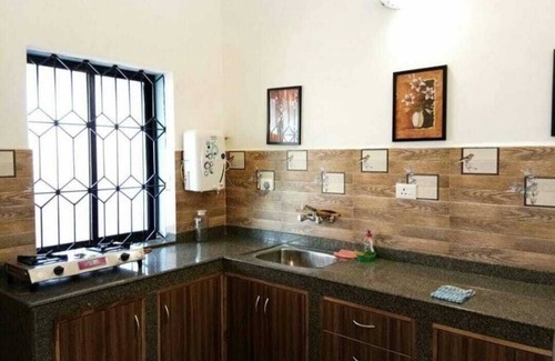 Kitchen has an induction or a gas stove ( only either ) crockery,refrigerator, toaster,microwave, kettle ,rice cooker .