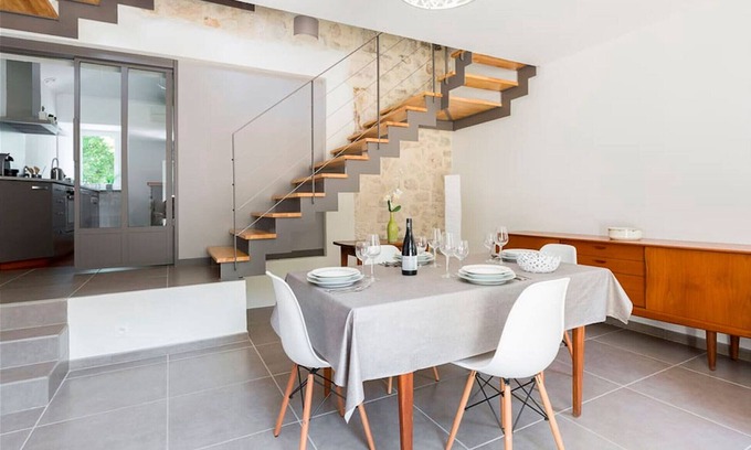 The ground floor consists of a living room, which opens onto the courtyard and communicates with the kitchen facing south. A large sliding glass roof allows, according to the desires, to close or leave communicate these two spaces. The kitchen, which we were able to keep the massive original wooden floors, has a central island and is fully equipped with American fridge freezer, dishwasher, oven, induction hob, Nespresso coffee machine, microwave , toaster, kettle, extractor hood to outside evacuation ... and little culinary library available to our guests.