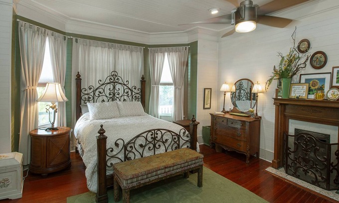 Enjoy the serenity in this huge suite with a super comfortable QUEEN SIZE bed, daybed & sitting area. Furnished with a mixture of antiques with added modern amenities such as a small fridge, smart TV, lighted make up mirror & hair dryer, ceiling & rotary fans plus central heat & air.