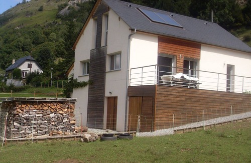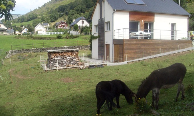 In the heart of the Ossau valley. Beautiful recent house of 112 M2 exposed due South on 3000 M2 of meadows. At an altitude of 600 m in Louvie-Soubiron. On the ground floor of the large living room, dining room with sofa and wood stove, access to the terrace, with lovely open views of the Pyrenees. Fully equipped open kitchen, washing machine, dishwasher, gas stove; oven. Bedroom with a 140 bed with shower room. Separate WC, hand basin.