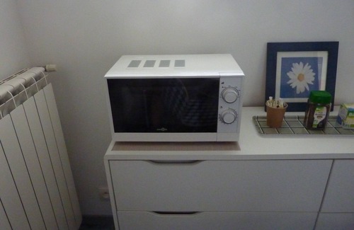 Fully renovated room with a large bed 2 places, a round table with 3 chairs, a refrigerator and a microwave.