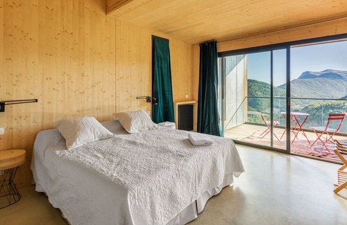 In the heart of a protected landscape, far from the hustle and bustle of everyday life, the estate is accessible by a non-tarred mountain road that climbs 2km, it consists of 5 houses built in Drôme stones and solid wood, which offer a total capacity of 17 rooms and can be privatized by a group of up to 35 people and 20 people for seminars!).