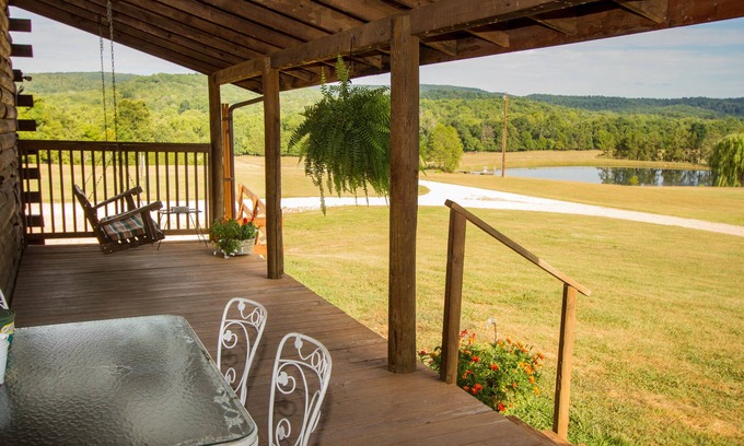 This fully furnished home has breathtaking panoramic views of the Ozark Mountains. Enjoy a perfect sunrise from a huge 50' covered front porch with a porch swing and chairs. This spacious cabin has plenty of room, so it's perfect for your family gathering or group.