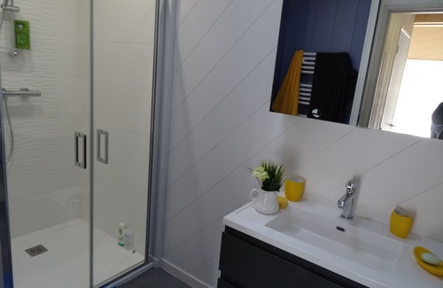 This house is equipped for 3 people of a bedroom with a double bed and a sofa bed in the living room (1.20m). A cot can be provided in the room.