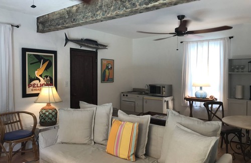 This Spanish style guest house is exceedingly private and offers one of the best locations on the island. A mere 100 yards from beautiful Gulf of Mexico beach and a short 3 block walk into town where one can find wonderful shopping, as well as fabulous restaurants and a bakery. One bedroom with queen bed; modern bath with large shower, large sitting room with flat screen TV and WiFi. Kitchenette with two burner cooktop, small sink, mini fridge, microwave, and coffee maker. Guest house has terra cotta tile floors and historical ceiling beams. Located on larger property with lawns and beautiful Florida landscaping.
