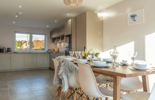 This stylish homestay can be many things; a rather indulgent and romantic escape for two, or a large and beautifully styled retreat for a group of friends or two families. With hard floors downstairs warmed by underfloor heating and sliding patio doors from the kitchen/dining room and large sitting room, this house is perfect for those who are wanting light, space and practicality with all the comforts you need including a superb master suite on the top floor and its rather indulgent bath tub. After a busy day exploring, relax in the gorgeous open-plan sitting room which leads out onto the rear terrace. The modern and sleek kitchen is well equipped with everything you'll need to rustle up romantic meals and snacks or indeed breakfast or supper for eight, and of course it comes with a Nespresso coffee machine for lazy mornings in bed too. The dining table chairs are dressed with sheepskin throws and the doors open up straight onto the garden. With a practical utility room too to store coats and boots, you won't be short of space. Upstairs you'll find four beautifully styled bedrooms. Two feature super-king size beds and all are decorated in varying shades of grey and white, perfect for relaxing and retiring to at the end of the day. The beds all have comfy bedding, throws and cushions and the windows overlook the pretty rural landscape or village. Although all the bedrooms are beautiful, the master suite on the top floor with separate dressing room tops them all, with its en-suite bathroom with a step-up large bath tub, where from the elevated position you can recline and enjoy the private and uninterrupted rural views, or possibly stargaze when the sky turns from blue to black on dark nights.