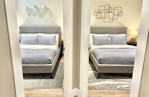 After entering the suite and turning to their left, guests will find the two equal sized rooms, each equipped with comfortable queen beds (bloom mattresses and premium quality bedding) and a large wardrobe. Nearby to the bedrooms, guests will find a 4-piece bathroom as well as an oversized storage closet, storing cleaning supplies, board games, bath towels, laundry supplies, and appliance manuals.
